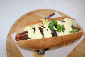 Hot dog – topped with a cheese sauce that complements the dish perfectly.
